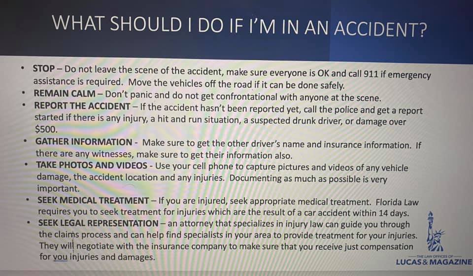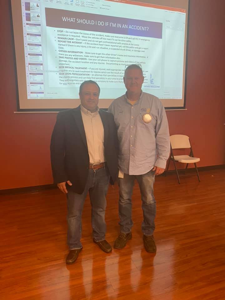 Guest Speaker, Attorney George Angeliadis with Law Office of Lucas & Magazine on "What to do if you're in an accident."